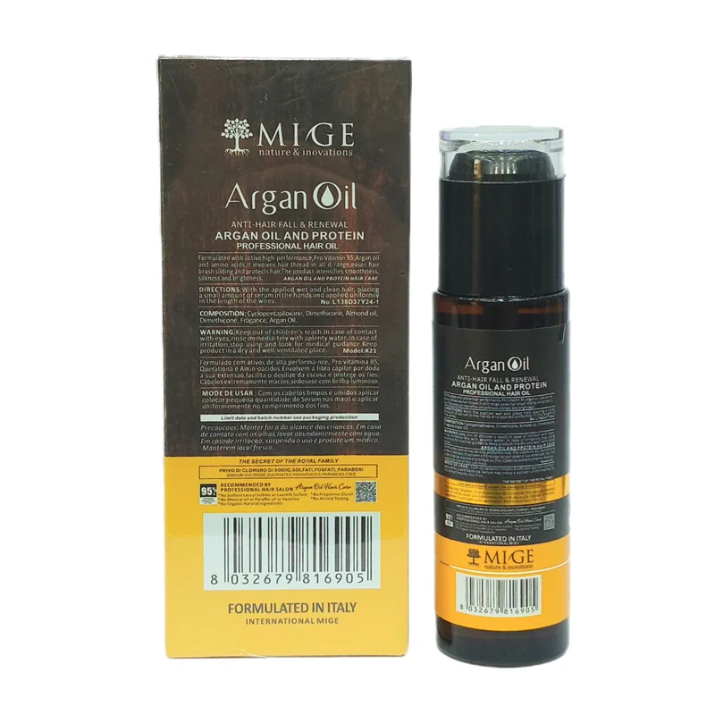 روغن آرگان ۹۵%Professional محصول کشور مراکش و سفارش داده شده توسط کمپانی ایتالیایی MIGE سرشار از مواد معدنی و ویتامین های مورد نیاز پوست و بخصوص مو است که غذای کاملی برای پوست و موی شماست. میباشند. رفع شکنندگی و موخوره، تقویت موهای آسیب دیده ناشی از رنگ، دکلره،مواد شیمیایی و حرارت، افزایش شفافیت، شادابی، حجم و استحکام مو، محرک رشد مو، کاهش و جلوگیری از ریزش “غیر طبیعی” مو همگی مزایای استفاده از روغن آرگان در موهای شماست. افزایش استحکام ناخن،حفظ چربی و رطوبت ناخن، ترمیم ناخن های آسیب دیده بر اثر استفاده از مواد شیمیایی، پیش گیری از شکنندگی و لایه لایه شدن ناخن ها، تقویت رشد ناخن و براقی آن، ترمیم زخمهای پس از مانیکور و کاشت ناخن که در اطراف ناخن ایجاد می گردد نیز خواص بینظیر آرگان بر ناخن هایتان است. تذکر: روغن آرگان خالص دارای هیچ افزودنی، شامل رنگ واسانس نبوده و رنگ آن طلایی میباشد و پس از چند دقیقه ماساژ هیچ گونه آثار چربی از خود بجای نگذاشته و کاملا جذب پوست می گردد.